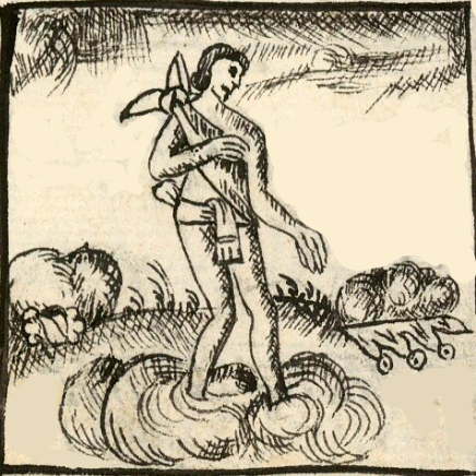 This iconographic example, featuring a black-line sketch in a black rectangle of a man standing in mud (zoquitl), is included in this digital collection for the purpose of making comparisons with related hieroglyphs. The term selected for this example comes from the text near the image in the Digital Florentine Codex. There is no gloss, per se. This example shows not only a Nahua man with his feet buried in swirling mud, but the landscape scene also includes two hieroglyphs, a stone (tetl) on the left and water (atl) on the right. The text explains that clay “is water and earth mixed together” (in Anderson and Dibble’s translation of the Nahuatl). The contextualizing image also shows a man working clay with his hands. Both men wear a cloak tied over a shoulder and pulled back so that they can work. They also wear loincloths. The shading on the bodies and on the cloth show European artistic influences. These drawings also include dark sky bands at the top of the rectangles–mostly made of hatch marks, but with some other indeterminate shapes.