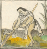 This farmer's digging stick (huictli) is an example of iconography included here with the intention of providing a comparison to glyphs of the same tool. The gloss for this tool is "coa," perhaps a Spanish corruption of the word for wood (cuahuitl) or an abbreviation for coatl (serpent), given its shape. Another agricultural tool, the axoquen, can have a serpent's head on the handle (see below).